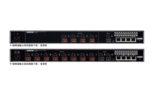 主機每一個頻道都有類比音訊輸出及4個Gigabit網路連接埠,4頻道及8頻道機櫃型裝置可作為MXW系統與電話會議及網路視訊會議的連接中心。